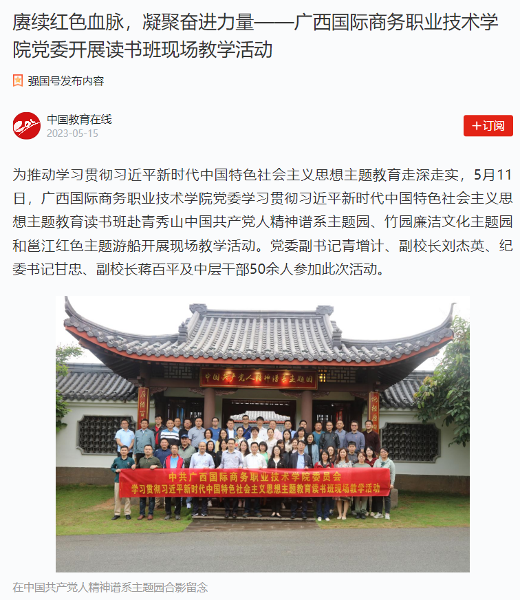 学习强国、中国教育在线、广西八桂职教网报道我校党委开展读书班现场教学活动。学习强国链接:https://a...